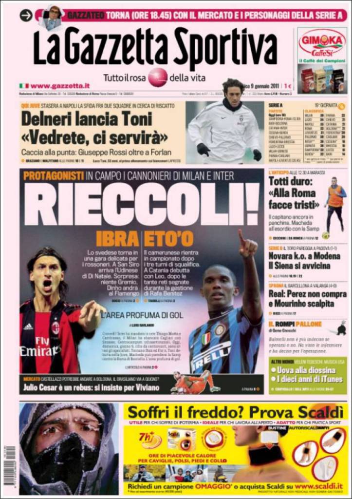 GAZZETTA DELLO SPORT RIECCOLI / La Gazzetta dello Sport quest’oggi apre con una prima pagina dedicata ai due bomber di Milan ed Inter, Ibrahimovic ed Eto’o che ritornano oggi in campo per l’ultima giornata del girone di ritorno.