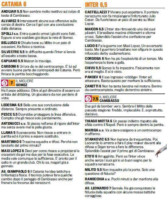FANTACALCIO SERIE A GAZZETTA CATANIA INTER PAGELLE – Una doppietta di Cambiasso permette all’Inter di vincere sul difficile campo di Catania per due a uno. La Gazzetta dello Sport premia l’argentino come migliore in campo. Ecco le pagelle.