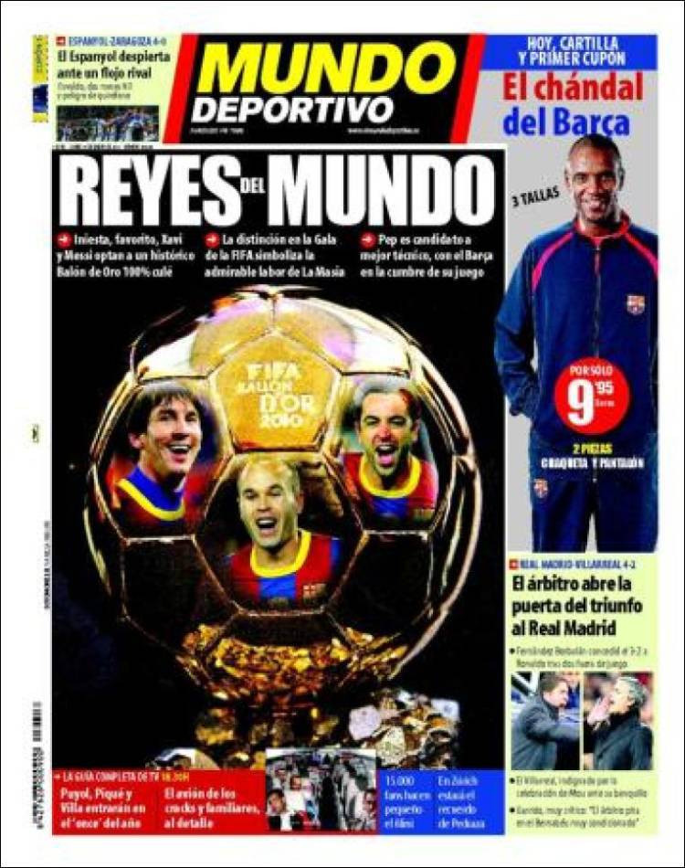 MUNDO DEPORTIVO PALLONE D’ORO – Sul quotidiano catalano Mundo Deportivo si parla del Fifa Pallone d’Oro 2010 che in questi giorni verrà assegnato. In lizza tre giocatori del Barcellona, Iniesta, Messi e Xavi con il primo favorito.