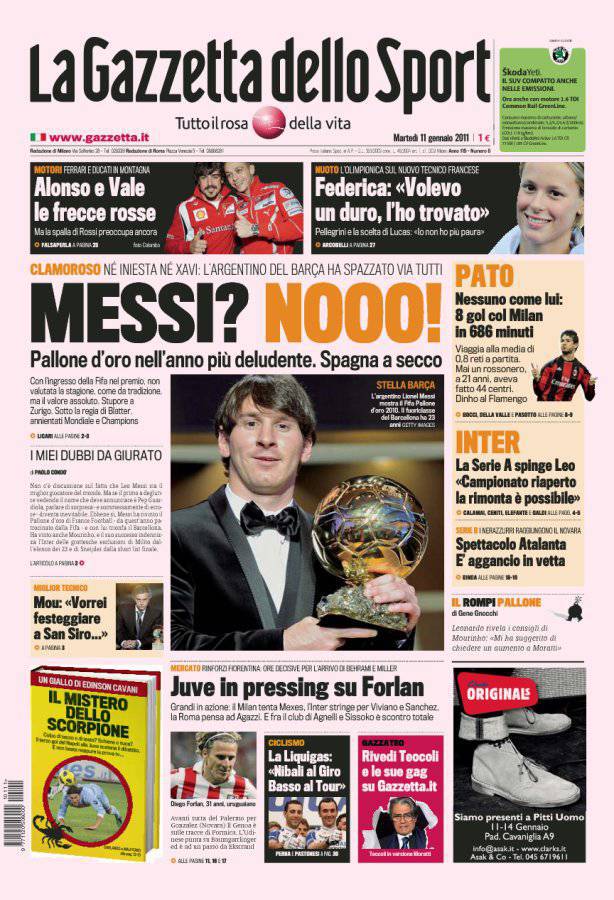 GAZZETTA MESSI – Sulla Gazzetta dello Sport si parla della vittoria del Fifa Pallone d’Oro da parte di Lionel Messi, già vincitore del Pallone d’Oro della scorsa stagione. A secco i vari Iniesta e Xavi.