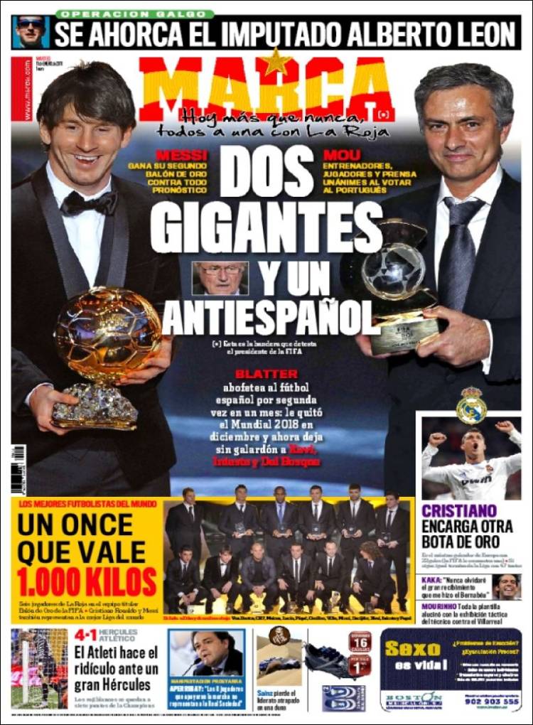 MARCA PALLONE D’ORO BLATTER – Il quotidiano Marca è polemico nei confronti del presidente Fifa Blatter definito come un antispagnolo. Applausi invece per Messi e Mourinho vincitori del Fifa Pallone d’Oro 2010 per la categoria calciatore e allenatore.