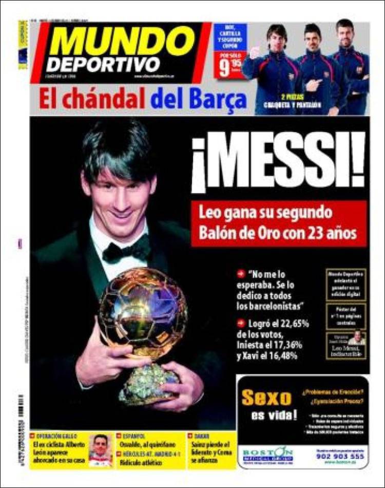 MUNDO DEPORTIVO MESSI BARCELLONA – Il quotidiano catalano Mundo Deportivo rende omaggio a Lionel Messi, vincitore del Fifa Pallone d’Oro 2010. L’argentino ha preceduto Iniesta e Xavi.