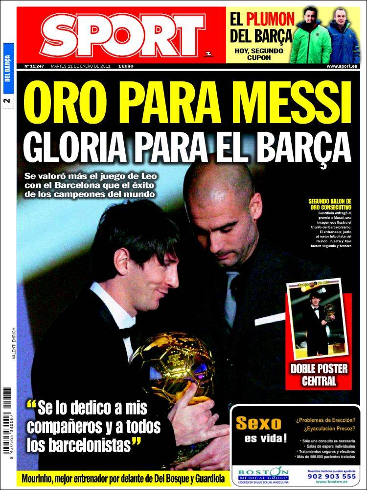 SPORT MESSI BARCELLONA – L’altro quotidiano catalano Sport applaude Lionel Messi, vincitore del Fifa Pallone d’Oro 2010 e tutto il Barcellona che ha visto anche il secondo e il terzo posto di Iniesta e Xavi e nella categoria allenatori il terzo posto di Guardiola.