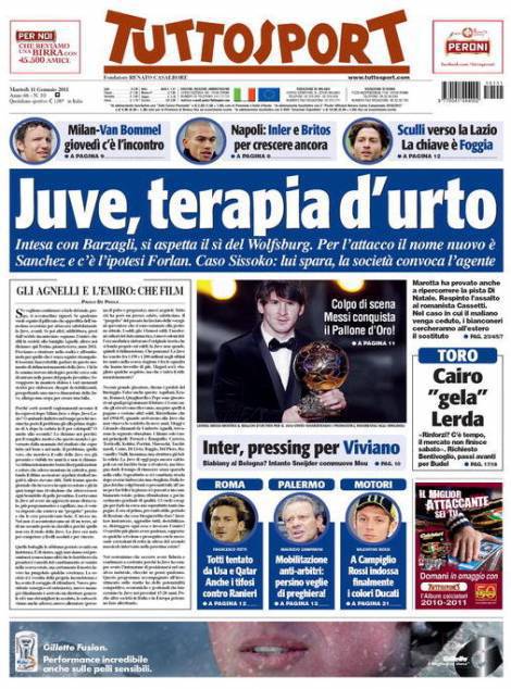 TUTTOSPORT JUVENTUS – Sul quotidiano torinese Tuttosport si parla del calciomercato della Juventus con i possibili arrivi di Barzagli in difesa e Diego Forlan per l’attacco. Intanto scoppia il caso Sissoko.