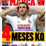 MARCA REAL MADRID HIGUAIN – Sul quotidiano madrileno Marca si parla dell’infortunio di Higuain che soffre di ernia discale. Il bomber argentino dovrà stare fermo quattro mesi, per lui la stagione è già finita.