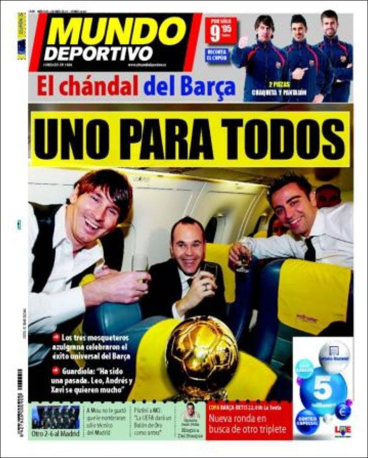 MUNDO DEPORTIVO PALLONE D’ORO – Sul quotidiano catalano Mundo Deportivo vengono riportate le foto dei festeggiamenti della vittoria di Lionel Messi nel Pallone d’Oro 2010 assieme ai due sconfitti Iniesta e Xavi.