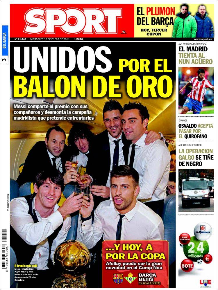 SPORT BARCELLONA – Anche l’altro quotidiano catalano Sport mostra le immagini della foto di gruppo di molti calciatori del Barcellona che festeggiano insieme a Messi la vittoria del Fifa Pallone d’Oro.