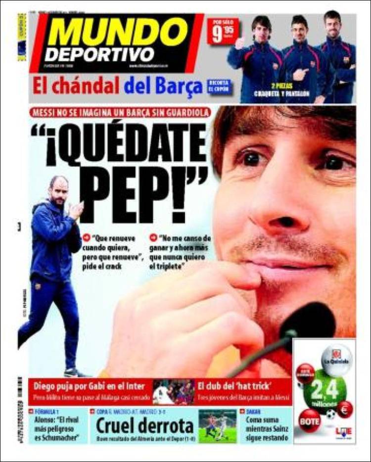 MUNDO DEPORTIVO GUARDIOLA BARCELLONA – Sul quotidiano catalano Mundo Deportivo vengono riportate le dichiarazioni di Lionel Messi, stella del Barcellona, che non immagina un Barça senza Guardiola.