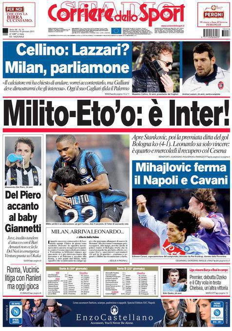CORRIERE MILITO ETO’O INTER – Sul Corriere dello Sport elogi per la coppia d’attacco dell’Inter Milito-Eto’o che hanno trascinato i nerazzurri alla vittoria contro il Bologna.