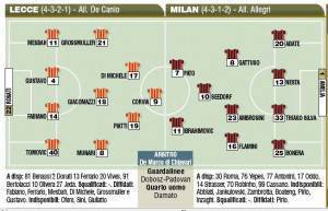 FANTACALCIO SERIE A PROBABILI FORMAZIONI GAZZETTA LECCE MILAN – Direttamente dalla Gazzetta le probabili formazioni di Lecce Milan: partita che in apparenza non sembra presentare difficoltà per la corazzata rossonera, ma i giallorossi in casa sono ossi duri e sono galvanizzati dalla vittoria esterna contro la Lazio. Tuttavia la difesa del Lecce è la peggiore del campionato e l’attacco stellare del Milan potrebbe diventare un incubo. Lecce che si schiera con il consueto 4-3-2-1, con il rientro di David Di Michele che agirà con Piatti alle spalle di Corvia unica punta. Il Milan invece si affida al 4-3-1-2 con Ibra e Pato supportati da Seedorf e dietro di loro il trio di mastini con Gattuso, Flamini e Ambrosini.