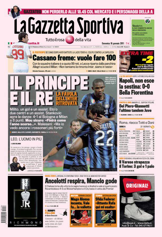GAZZETTA MILITO ETO’O – Sulla Gazzetta dello Sport si parla della vittoria dell’Inter sul Bologna per quattro a uno con doppietta di Eto’o e gol di Milito e Stankovic.