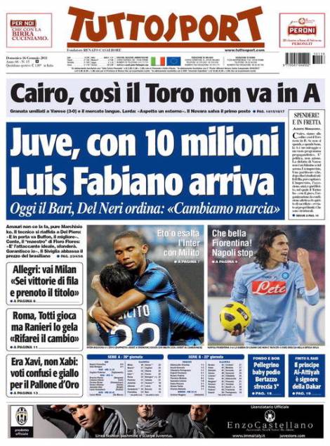 TUTTOSPORT LUIS FABIANO JUVENTUS – Su Tuttosport si parla invece del calciomercato Juventus con il possibile arrivo a Torino di Luis Fabiano, bomber del Siviglia.