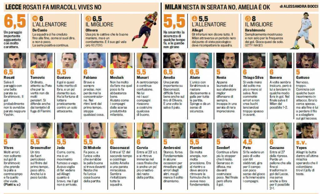 Fantacalcio Serie A, voti Gazzetta di Lecce-Milan – Pagelle in foto 17/01/2011 di Ruggieri PAGELLE FANTACALCIO LECCE MILAN GAZZETTA – La Gazzetta dello Sport premia Ibrahimovic come migliore in campo nel match tra Lecce e Milan. Bene anche Olivera, male Pato. Ecco i voti e pagelle. Claudio Ruggieri – www.calciomercatonews.com
