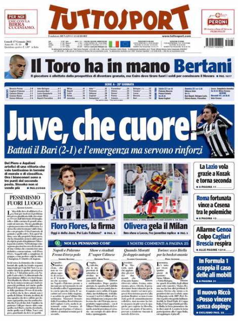 TUTTOSPORT JUVENTUS – Il quotidiano Tuttosport parla del due a uno della Juventus in casa contro il Bari con il gol decisivo di Aquilani. In rete anche il capitano Del Piero.