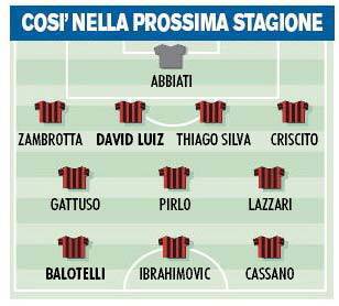 CALCIOMERCATO MILAN BALOTELLI DAVID LUIZ – Il calciomercato del Milan è molto attivo non solo per il mercato invernale di gennaio ma anche per quello della prossima stagione. Infatti come rivela il Corriere dello Sport Galliani e soci stanno già programmando i colpi della prossima stagione. In pole position per vestire la maglia rossonera c’è Mario Balotelli, talento del Manchester City ed ex giocatore dell’Inter. Un attacco atomico con Balotelli-Ibrahimovic-Cassano. In difesa per il dopo Nesta si pensa a David Luiz, centrale del Benfica e compagno di reparto nel Brasile di Thiago Silva. Entrambi acquisti costosi, per questo nel Milan del futuro non dovrebbe esserci Pato. Ecco la foto della possibile formazione della prossima stagione.