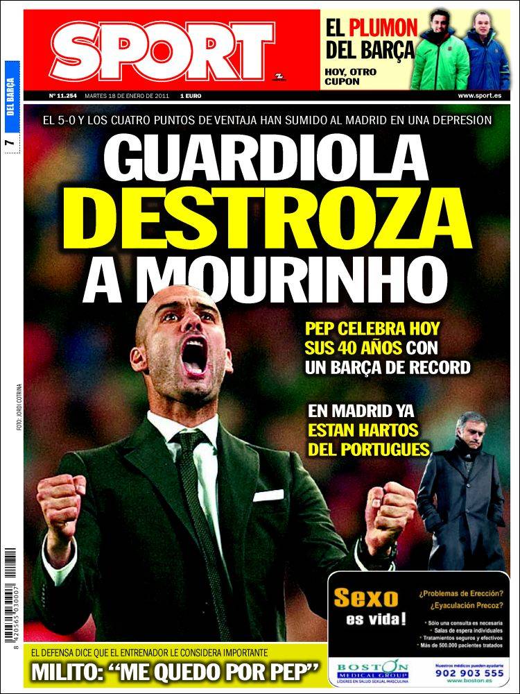 SPORT GUARDIOLA MOURINHO – Sul quotidiano catalano Sport viene elogiato il tecnico del Barcellona Guardiola che oggi compie 40 anni con un altro record battuto dalla sua formazione.
