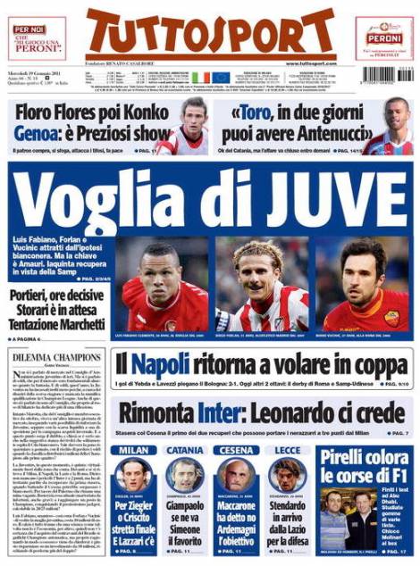 TUTTOSPORT JUVENTUS – Sul quotidiano Tuttosport si parla del calciomercato Juventus con il possibile arrivo di un attaccante. I nomi più gettonati sono quelli di Vucinic, Luis Fabiano e Forlan.