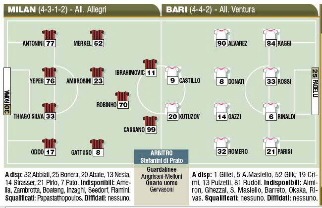 COPPA ITALIA MILAN BARI FORMAZIONI – Il Milan affronta questa sera il Bari negli ottavi di finale di Coppa Italia. Allegri manda in campo il tridente Robinho-Cassano-Ibrahimovic. Le formazioni secondo il Corriere dello Sport.