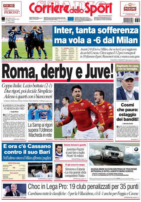 CORRIERE ROMA COPPA ITALIA – Il Corriere dello Sport parla invece della vittoria della Roma nel derby di Coppa Italia contro la Lazio. Ora i giallorossi affronteranno la Juventus.