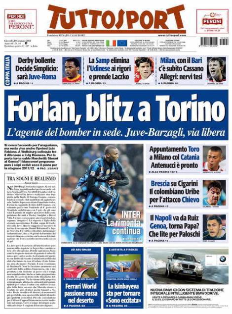 TUTTOSPORT FORLAN JUVENTUS – Sul quotidiano torinese Tuttosport si parla del calciomercato della Juventus con il blitz a Torino del procuratore di Forlan.