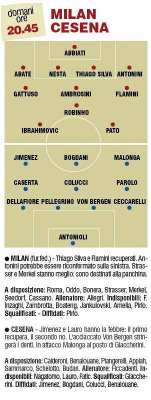 FANTACALCIO MILAN CESENA PROBABILI FORMAZIONI – Il Milan capolista ospiterà a San Siro il Cesena. Allegri riproporrà il tridente formato da Robinho-Ibrahimovic-Pato ma occhio a Cassano. Nel Cesena spazio a Malonga. Le formazioni secondo il Corriere dello Sport.