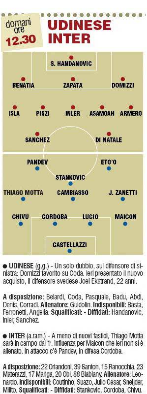 FANTACALCIO UDINESE INTER PROBABILI FORMAZIONI – L’Inter domani scenderà in campo alle 12.30 sul campo dell’Udinese. Leonardo darà spazio nuovamente a Cordoba con Ranocchia in panchina, mentre a centrocampo Thiago Motta titolare. Nell’Udinese tanem d’attacco Sanchez-Di Natale. Le formazioni del Corriere dello Sport.