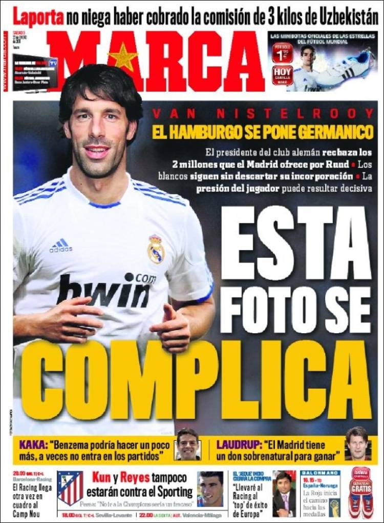 MARCA REAL MADRID – Sul quotidiano madrileno Marca si parla del calciomercato del Real Madrid con i madrileni sempre a caccia di Van Nistelrooy, ex bomber del Real attualmente all’Amburgo.