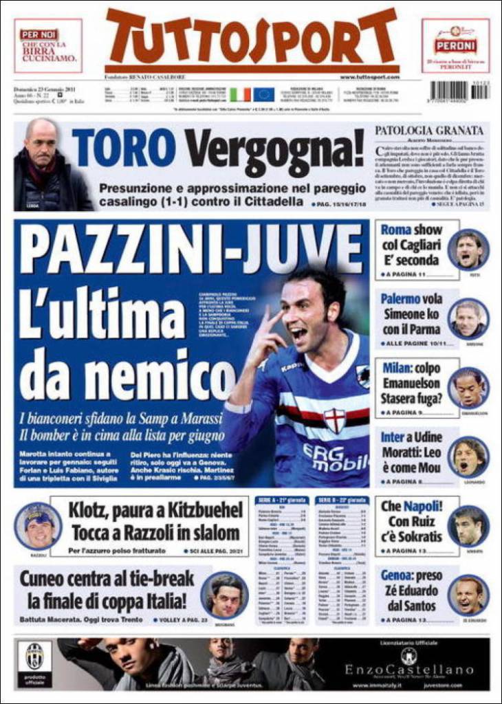 TUTTOSPORT PAZZINI JUVE / Il quotidiano sportivo Tuttosport, questa mattina, apre con una prima pagina interamente dedicata alla sfida, sul campo e sul mercato, tra Juventus e Sampdoria. Oggetto della sfida è soprattutto Gianpaolo Pazzini, obiettivo di mercato dei bianconeri per Giugno.