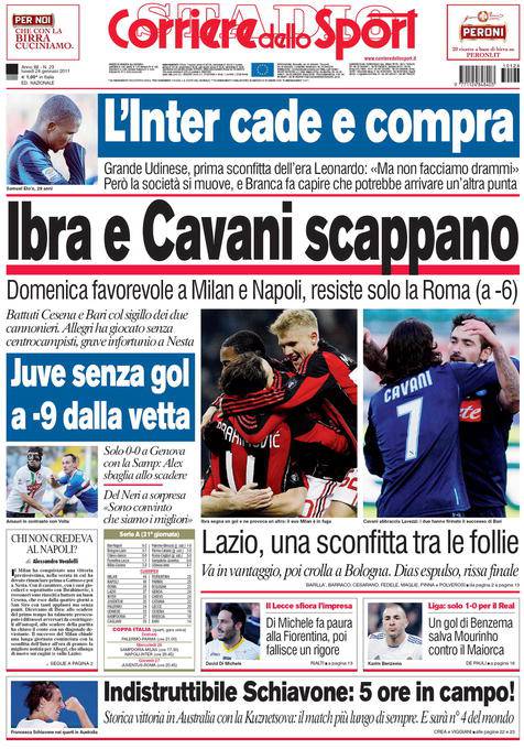 CORRIERE IBRA CAVANI – Sul Corriere dello Sport si parla delle vittorie di Milan e Napoli e della sconfitta dell’Inter sul campo dell’Udinese per tre a uno.