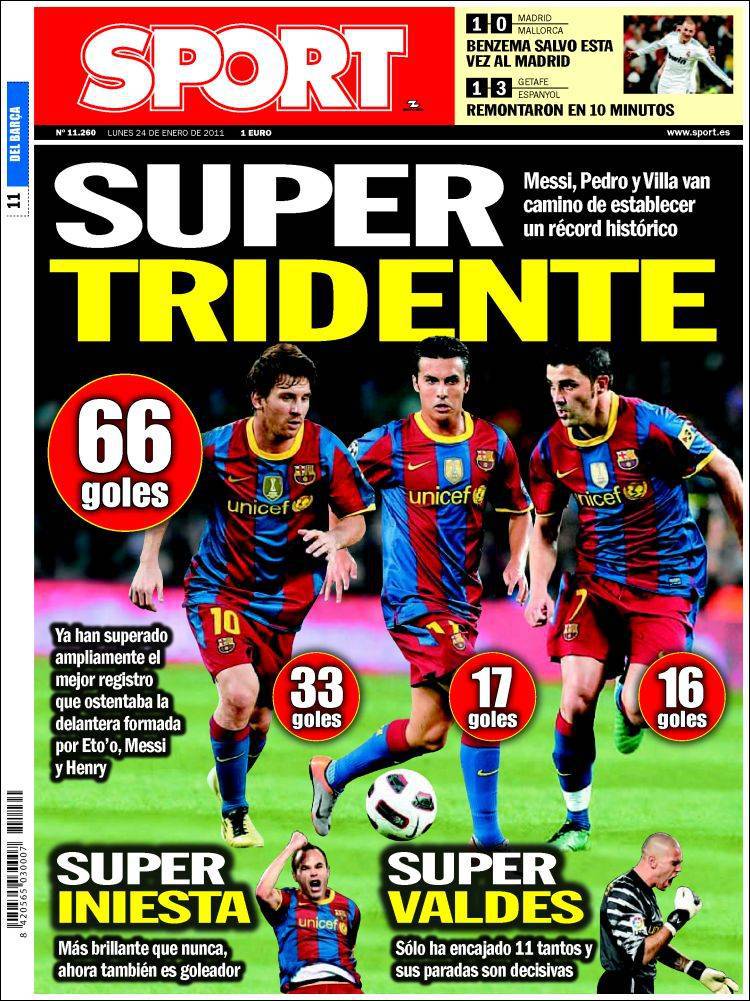 SPORT BARCELLONA TRIDENTE – Sull’altro quotidiano catalano Sport si parla del tridente d’attacco del Barcellona formato da Villa-Messi-Pedro che hanno già segnato 66 gol in stagione.