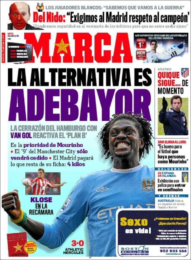 MARCA ADEBAYOR CALCIOMERCATO – Sul quotidiano Marca si parla del calciomercato del Real Madrid con l’interessamento dei madrileni per Adebayor.