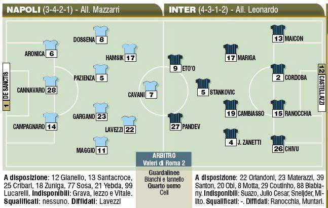 COPPA ITALIA NAPOLI INTER FORMAZIONI – Questa sera al San Paolo quarti di finale di Coppa Italia tra Napoli e Inter. Mazzarri punta sul tridente titolare Cavani-Lavezzi-Ranocchia, Leonardo si affida a Pandev-Eto’o. Le probabili formazioni secondo il Corriere dello Sport.