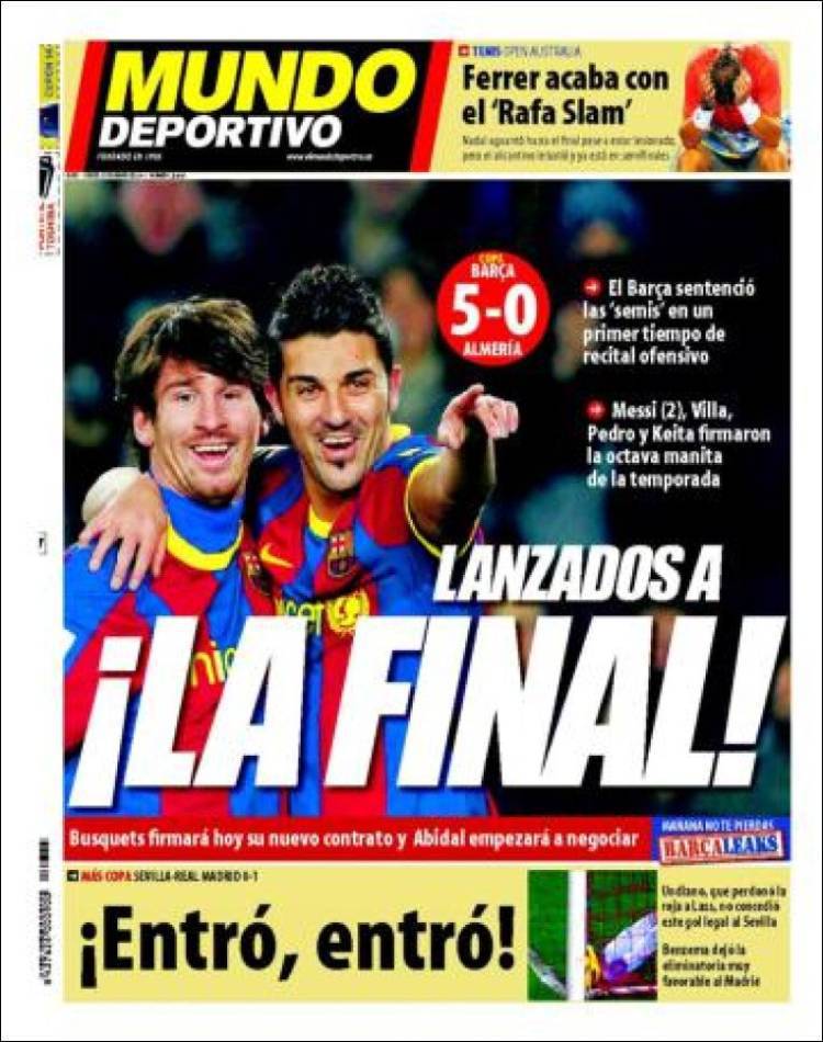 MUNDO DEPORTIVO BARCELLONA – Il quotidiano catalano Mundo Deportivo parla della vittoria per 5 a 0 del Barcellona contro l’Almeria nella semifinale d’andata della Coppa del Re. La finale è vicina.