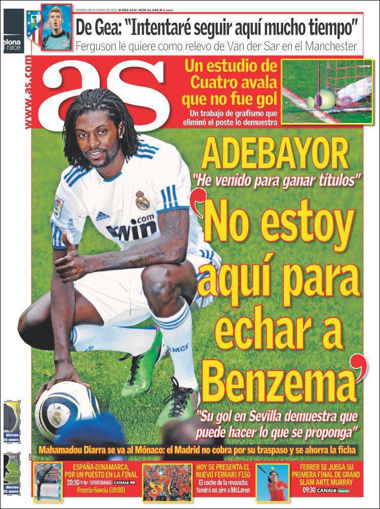 RASSEGNA ESTERA AS ADEBAYOR PRESENTAZIONE- Prima pagina di AS dedicata al nuovo arrivo in casa Real, Emmanuel Adebayor, in prestito dal Manchester City. L’attaccante africano ha dichiarato di voler vincere dei titoli con la maglia dei blancos e ha negato l’esistenza di un collegamento tra il suo acquisto e la situazione di Benzema