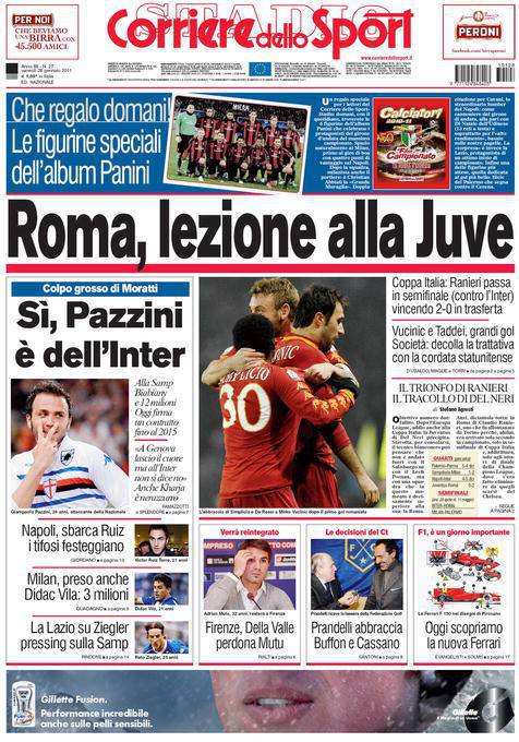 CORRIERE DELLO SPORT ROMA-JUVENTUS COPPA ITALIA- Nella prima pagine del Corriere dello Sport si tratta la vittoria della Roma in Coppa Italia, dove ha battuto la Juve per 2 a 0. I giallorossi, a segno con due bei gol di Vucinic e Taddei, passano dunque alle semifinali, dove affronteranno l’Inter.