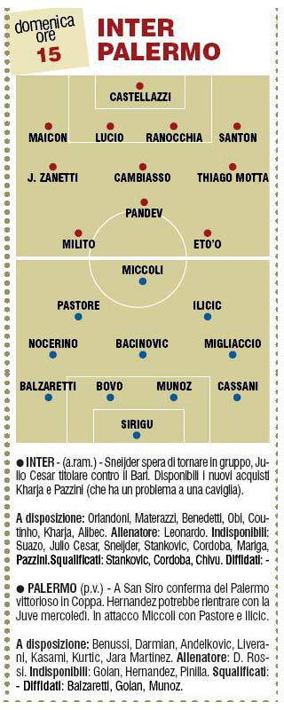 FANTACALCIO INTER PALERMO PROBABILI FORMAZIONI – Domenica big match a San Siro tra Inter e Palermo. Leonardo potrà avere a disposizione i due nuovi Kharja e Pazzini, probabile che giochi solo il primo da titolare visto l’infortunio di Stankovic. Le formazioni secondo il Corriere dello Sport.