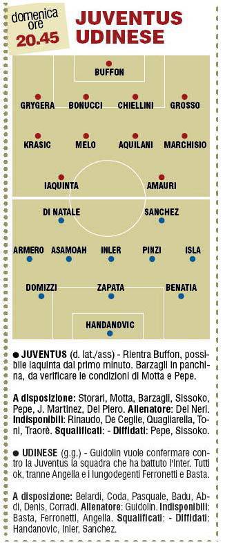FANTACALCIO JUVENTUS UDINESE PROBABILI FORMAZIONI FOTO – Domenica sera la Juventus di Delneri ospiterà la lanciatissima Udinese di Guidolin. Per l’occasione il tecnico bianconero proporrà la coppia d’attacco formata da Amauri-Iaquinta. Le probabili formazioni secondo il Corriere dello Sport.