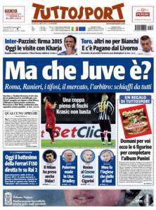 TUTTOSPORT PRIMA PAGINA RASSEGNA STAMPA ROMA JUVE COPPA ITALIA- Anche Tuttosport apre la prima pagina con la notizia della sconfitta bianconera in Coppa Italia. La Roma ha vinto per 2 a 0 ottenendo il passaggio alle semifinali. Il giornale torinese riporta la notizia accennando anche al rigore negato a Del Piero.