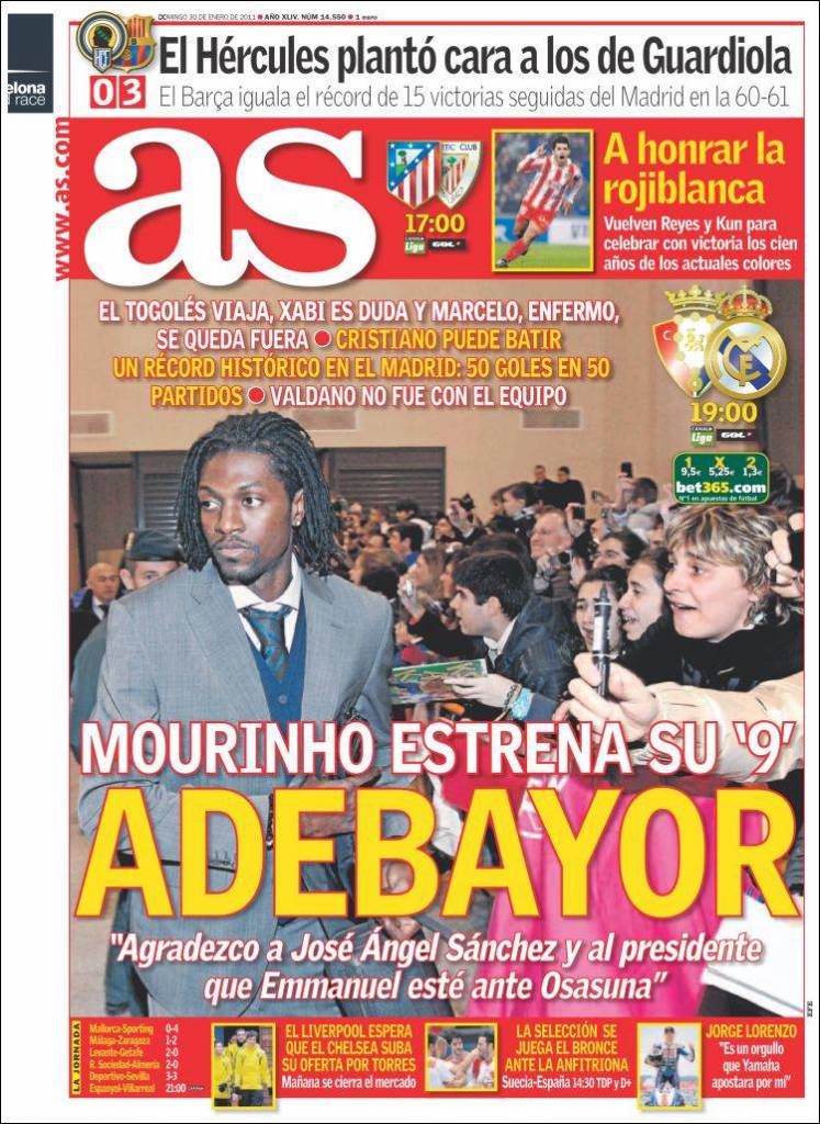 AS MOURINHO REAL MADRID – Contro l’Osasuna il tecnico del Real Madrid Josè Mourinho punterà subito su Adebayor, nuovo acquisto della società madrilena.