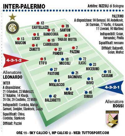 FANTACALCIO INTER-PALERMO PROBABILI FORMAZIONI – Fra poco più di un’ora allo stadio San Siro di Milano si terrà l’attesa sfida fra l’Inter e il Palermo. I nerazzurri rigenerati dalla cura Leonardo proveranno a cancellare subito la bruciante sconfitta di 7 giorni fa in quel del Friuli. Spazio subito ai due nuovi arrivati, Pazzini e Kharja, che visto l’emergenza infortuni potrebbero partire dal primo minuto. Palermo con la formazione tipo. Miccoli c’è anche se non al 100%.