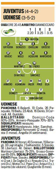 FANTACALCIO SERIE A JUVENTUS-UDINESE PROBABILI FORMAZIONI – Sfida caldissima in programma questa sera allo stadio Olimpico di Torino. La Juventus cercherà infatti di tornare alla vittoria dopo la sconfitta in Coppa Italia con la Roma e il pareggio a reti bianche contro la Sampdoria. Emergenza totale per mister Delneri che in vista del posticipo di questa sera dovrà fare a meno di Iaquinta ed Amauri in attacco, oltre naturalmente a Quagliarella. Spazio quindi all’inedita coppia Del Piero-Martinez. Nell’Udinese tutto come da copione. Guidolin punta sugli 11 che hanno fermato il Milan e battuto l’Inter.