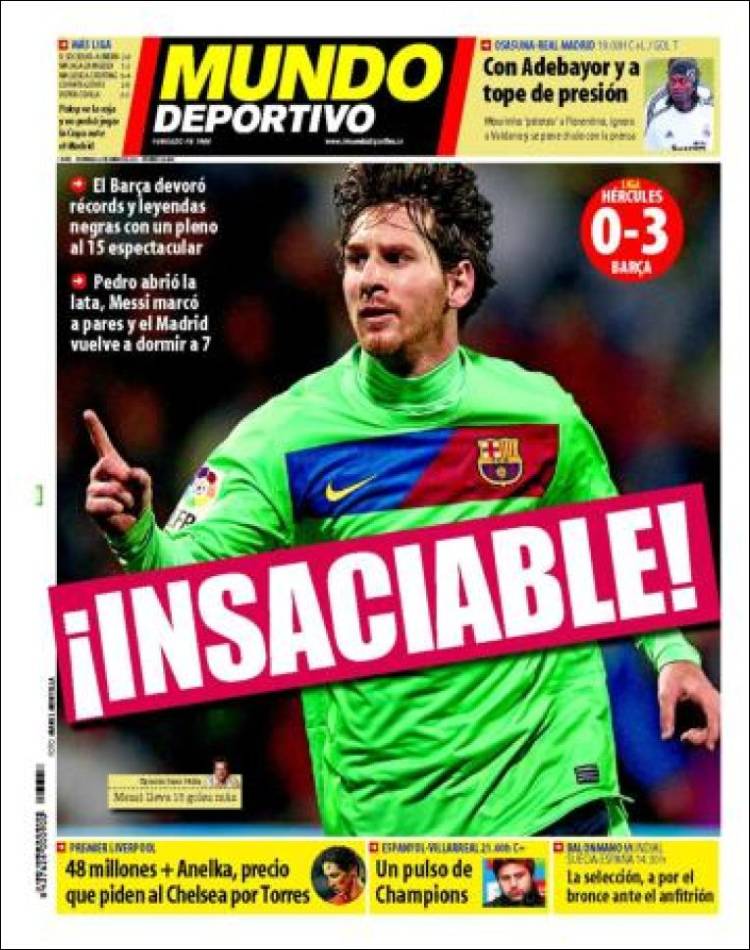 MUNDO DEPORTIVO MESSI BARCELLONA – Sul quotidiano catalano Mundo Deportivo si parla del tre a zero del Barcellona sul campo dell’Hercules con i gol di Pedro e la doppietta del grande Lionel Messi.