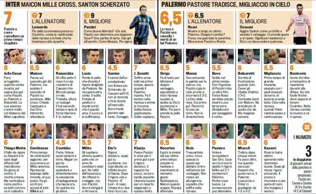 Fantacalcio, voti Gazzetta di Inter-Palermo – Pagelle in foto 31/01/2011 di Ruggieri FANTACALCIO GAZZETTA VOTI PAGELLE INTER PALERMO – E’ Pazzini il migliore in campo nel match tra Inter e Palermo. Bene anche Eto’o, male Santon e Coutinho. Ecco le pagelle della Gazzetta dello Sport. Claudio Ruggieri – www.calciomercatonews.com