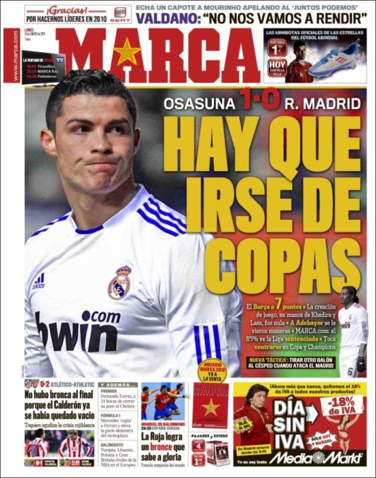 MARCA REAL MADRID – Il Real Madrid di Mourinho perde uno a zero in casa dell’Osasuna e si allontana sempre di più dal Barcellona capolista, ora distante sette punti.