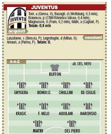 CALCIOMERCATO JUVENTUS ACQUISTI CESSIONI FORMAZIONE FOTO – Di seguito trovato l’elenco completo di tutti gli acquisti e di tutte le cessioni relative al calciomercato di riparazione 2011 della Juventus. Inoltre, la foto della nuova probabile formazione della Juventus a conclusione delle trattative invernali. Gli acquisti, le cessione e la nuova formazione sono a cura della redazione de Il Corriere dello Sport.