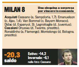 CALCIOMERCATO MILAN VOTI BILANCIO ACQUISTI CESSIONI – Di seguito trovate il quadro completo relativo al calciomercato di riparazione 2011 del Milan. Troverete il voto alle varie trattative, l’elenco completo degli obiettivi e degli acquisti e infine il bilancio economico, il saldo fra entrate e uscite. Vi ricordiamo che il voto, il bilancio economico e l’elenco delle varie operazioni sono cura della redazione de La Gazzetta dello Sport.