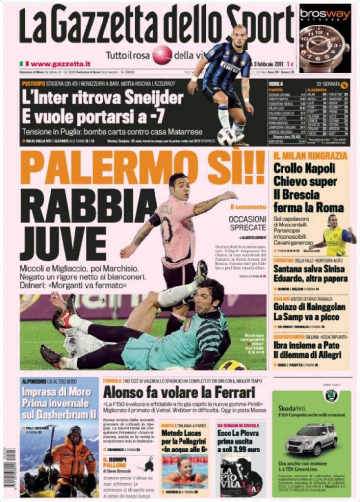 GAZZETTA DELLO SPORT PALERMO JUVE / La prima pagina della Gazzetta dello Sport stamani si concentra sul big match di ieri sera, disputatosi al Barbera di Palermo tra i padroni di casa rosanero e la Juventus. La vittoria del Palermo ha portato si molto entusiasmo, ma anche molte polemiche date le varie recriminazioni della Juventus su un paio di episodi, definiti da Delneri e Marotta nettamente a sfavore dei bianconeri.