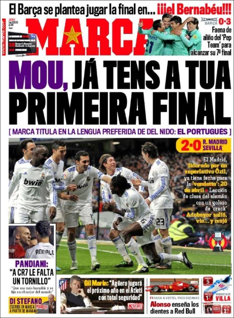 RASSEGNA ESTERA MARCA MOURINHO BARCELLONA FINALE COPPA DEL RE REAL MADRID- Il giornale spagnolo Marca apre in prima pagina con la notizia della vittoria del Real Madrid sul Siviglia che regala a Mourinho la prima finale da quanto è allenatore dei blancos, quella della Coppa del Re. Il Barcellona, che ha eliminato l’Almeria, conquistando il secondo posto da finalista.