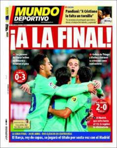 RASSEGNA ESTERA MUNDO DEPORTIVO BARCELLONA COPPA DEL RE FINALE- Mundo Deportivo, giornale catalano, dedica la sua prima pagina alla vittoria del Barcellona nella semifinale di Coppa del Re, vinta dai blaugrana per 3 a 0. In finale gli uomini di Guardiola incontreranno il Real Madrid.