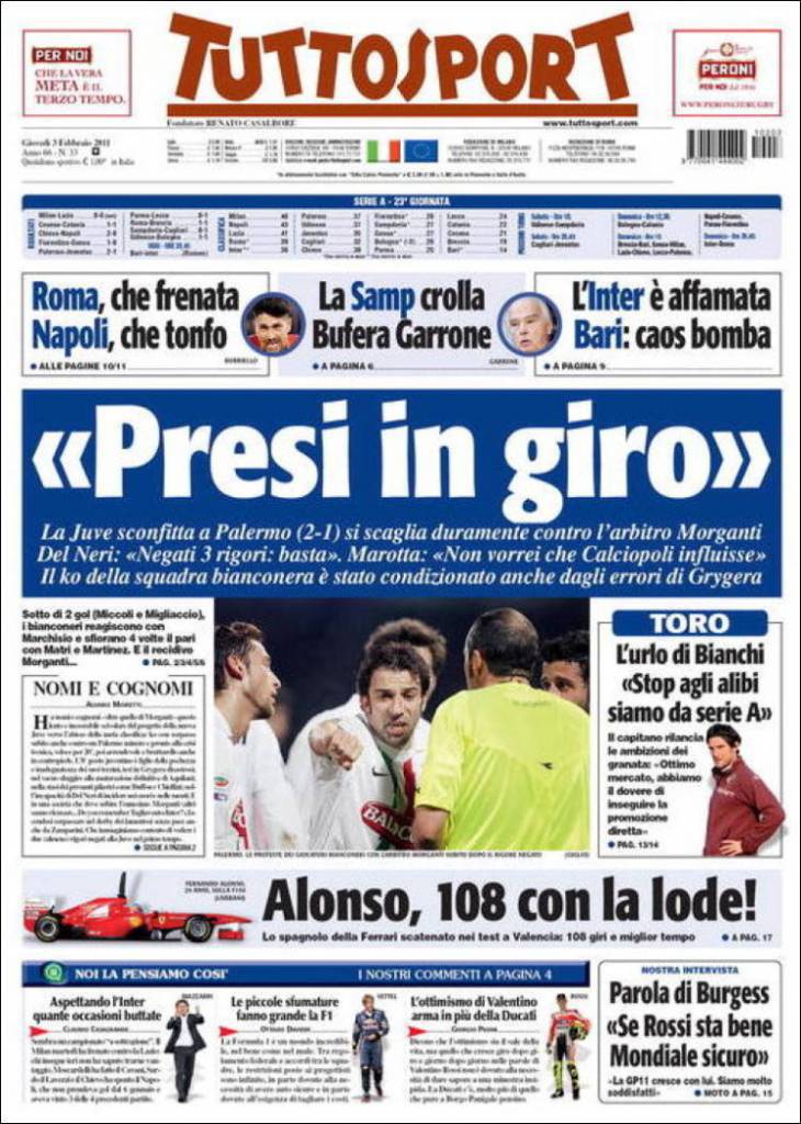 TUTTOSPORT / Polemica questa mattina l’edizione di Tuttosport, che decide di aprire con le dichiarazioni dell’immediato post partita di Marotta e Delneri. La Juventus che si è vista negare almeno due rigori netti, secondo la dirigenza bianconera, è uscita dal Barbera con le ossa rotte dopo l’ennesima sconfitta in campionato. Le polemiche avranno sicuramente degli strasichi, dato che la dirigenza bianconera ha richiamato anche lo scottante tema di calciopoli.